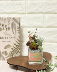 四角い花器のサンドアートです。フェイクグリーンなので、日当たりを気にせずお好きなところに置けますし、虫も寄ってこず、お手入れの必要もございません。