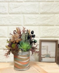 四角い花器のサンドアートです。フェイクグリーンなので、日当たりを気にせずお好きなところに置けますし、虫も寄ってこず、お手入れの必要もございません。